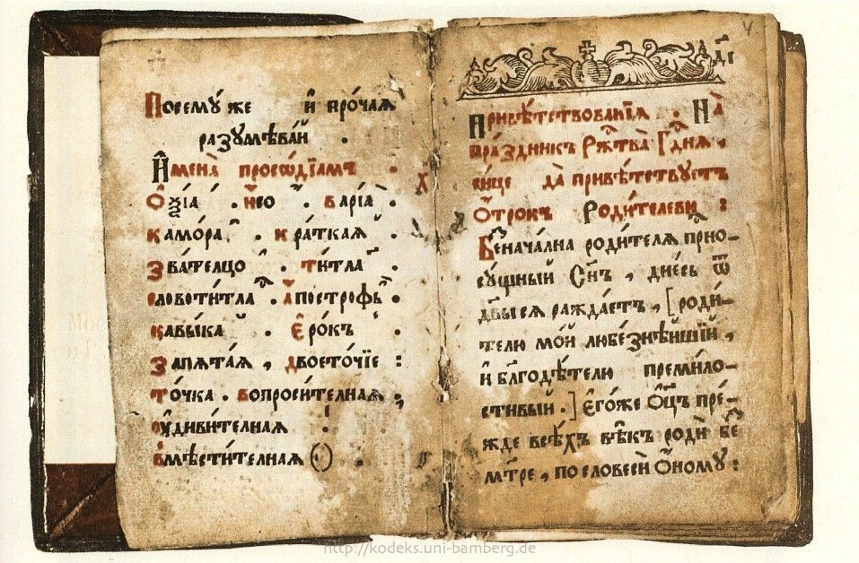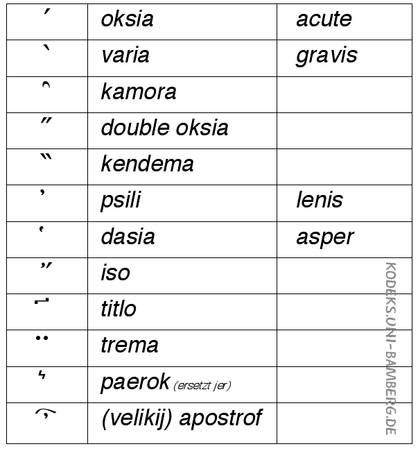 | Die Abbildung oben zeigt auf der linken Seite die Akzente und Satzzeichen samt ihren Namen in einer kirchenslawischen Grammatik von 1664: